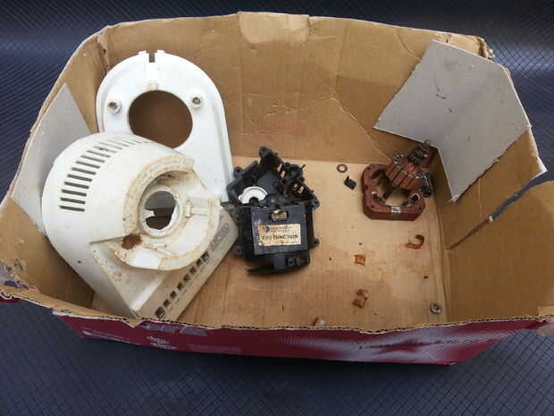 Los elementos desechados incluyendo la caja del mezclador y las partes metálicas corroídas.