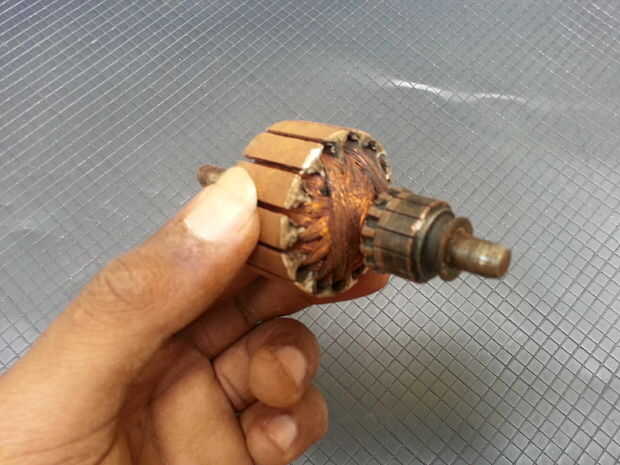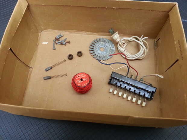 Los elementos rescatados incluye el interruptor de push botón multi, un cable, un par de tornillos, un par de carbón las escobillas, un ventilador de metal, dos rodamientos y por último pero no menos importante, los alambres de cobre aislados.