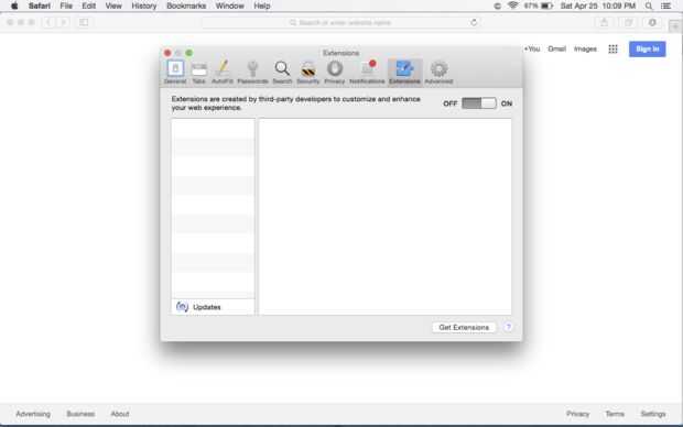 En primer lugar abrir Safari para que sea abierto a la pantalla de inicio (no importa qué navegador es le principal del navegador). A continuación clic en Safari justo al lado del logo . Una vez usted ha hecho clic en el clic de botón de Safari el botón preferencias. Una vez en las preferencias encontrarás las extensiones y las extensiones se encuentra el adware (no tengo ningún adware en el momento pero si había ser adware sería aquí y para deshacerse de él simplemente haga clic en quitar).