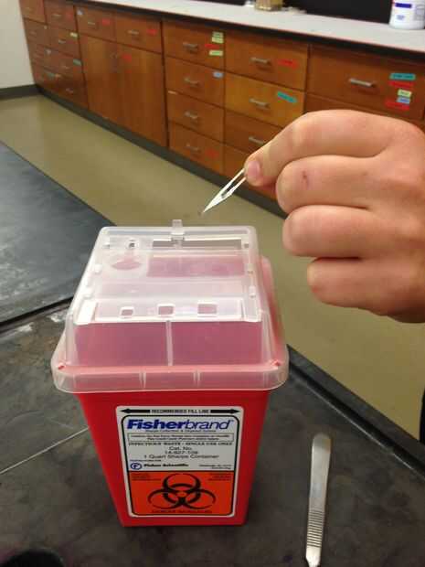 Paso 7: Colocar todas las hojas utilizadas en proceso de disección en el contenedor designado biohazard