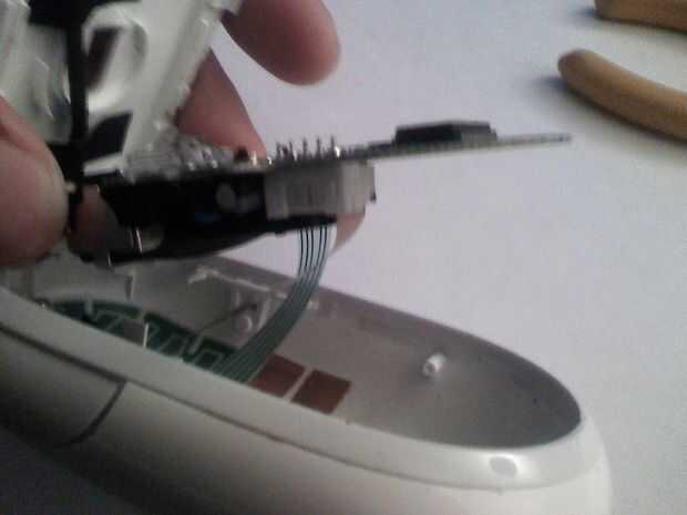 Dos cables planos van desde la caja de la bola de ratón y otro en la parte superior del ratón. Utilizar la pequeña cabeza plana para desconectar el cable plano del clip en el PCB.