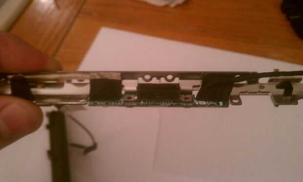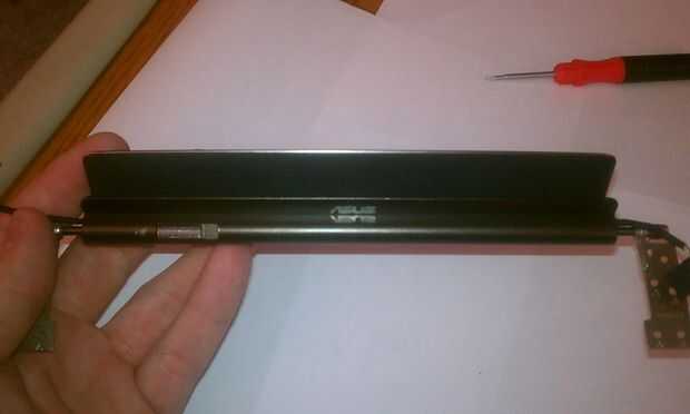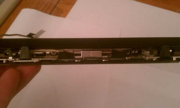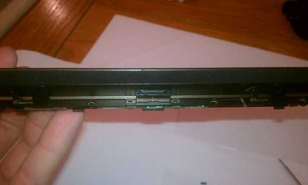 A continuación, en la parte que todavía tiene el conector de datos y bisagras fijadas, se dará cuenta que hay una pequeña tira de plástico que corre a lo largo de la pieza. Introduzca el cuchillo a un lado de esta pieza, luego deslice la cuchilla en el otro extremo con el fin de quitar fácilmente. Usted necesitará manipular el angula de cierre con el fin de eliminar completamente esta cubierta.