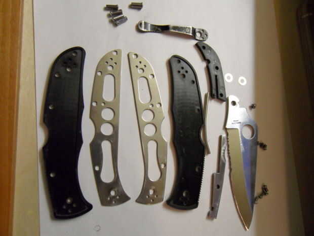 a continuación, puede levantar la hoja y apartar las arandelas de bronce-fósforo por encima y por debajo de ella. Estos son lo que necesita para limpiarse si el cuchillo no se abre sin problemas. Sacar el lockback y limpie cualquier suciedad. Sacar la pieza de plástico en el medio, la placa inferior, los postes del tornillo y limpiar todo.