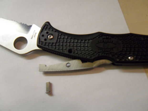 El cuchillo ahora es más o menos montado, menos el clip de bolsillo y lock-back (todos los tornillos restantes son del tipo de .25in T-6 más largo). Poner el lockback en su ranura en la parte posterior de la cuchilla. Alinee el orificio en el lockback con el orificio del tornillo. Esto tendrá alguna fuerza, como la primavera se le resiste. Cuando tienes lo alinearon y mantiene en su lugar, pase el post de tornillo por el agujero de debajo.