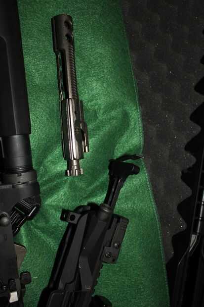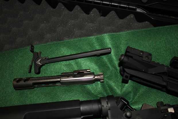 A continuación, lentamente tire de la palanca de carga hacia atrás, mientras los receptores superiores e inferiores están separados, a mitad de camino. Luego saque el grupo del portador del perno y póngala a un lado. Por último, quitar la palanca de carga, pero tenga cuidado con las muescas que hay en la palanca de carga. Usted tendrá que levantar la palanca de carga de la parte superior del rifle para asegurarse de que las muescas no captura en el receptor superior. Una vez sacado, fijó a un lado también.