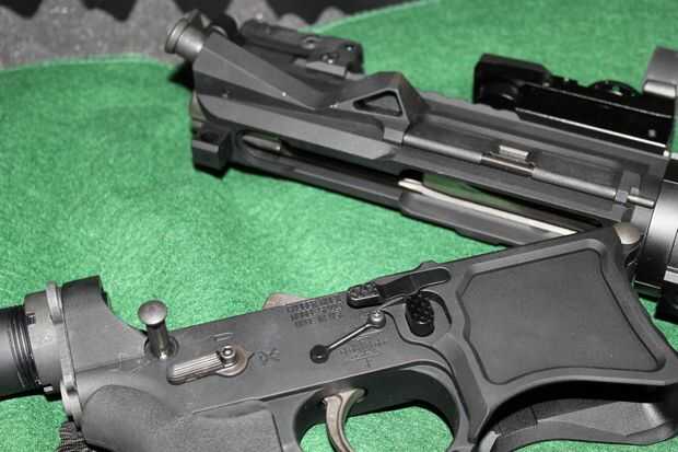 Separe lentamente el receptor superior e inferior, en caso de que alguna pieza vino flojo y puede volar. En este punto, tienes una opción, usted puede sacar el perno de desmontaje hacia adelante y separar completamente la parte superior e inferior receptor o simplemente dejarlo en y pivote abierta. Por el bien de este conjunto de instrucciones, saldremos adelante perno de desmontaje en, pero lo no hará diferencia de cualquier manera en lo que respecta al campo real de la carabina.