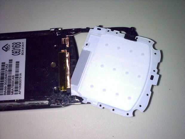 Para quitar los dos tornillos restantes, debemos apalancar la membrana del teclado y deslice hacia abajo la placa frontal. La membrana del teclado es fácilmente desmontable; sólo empujarlo con los dedos hasta "pop" y sacarlo hacia fuera. Después de eso, usted Deslice hacia atrás la placa frontal ("cerrar" el teléfono"), y verá los cuatro tornillos que faltan. Tomar el destornillador Phillips esta vez y llevarlos a cabo.