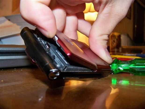 Cierre el teléfono y dale la vuelta. A lo largo de la parte superior del teléfono donde la tapa de las bisagras de la base en el centro habrá una plata pequeña como botón. Pulse este botón. La tapa de la batería estará apagado. Figura 1.