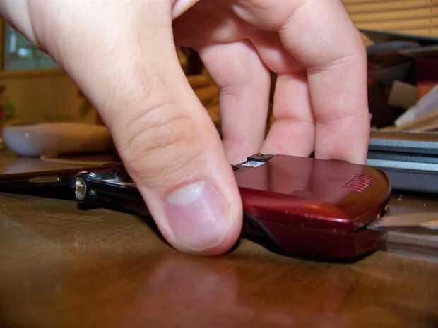Para esta siguiente parte necesita ambas manos. Colocar el pulgar en la parte inferior del teléfono y el dedo índice en el labio de la base (cerca de donde estaba la tarjeta sim o de memoria) se aplica una fuerza hacia arriba con el dedo corazón contra el teléfono. Utilizar el pulgar como punto de pivote. Te darás cuenta de la costura creando un
