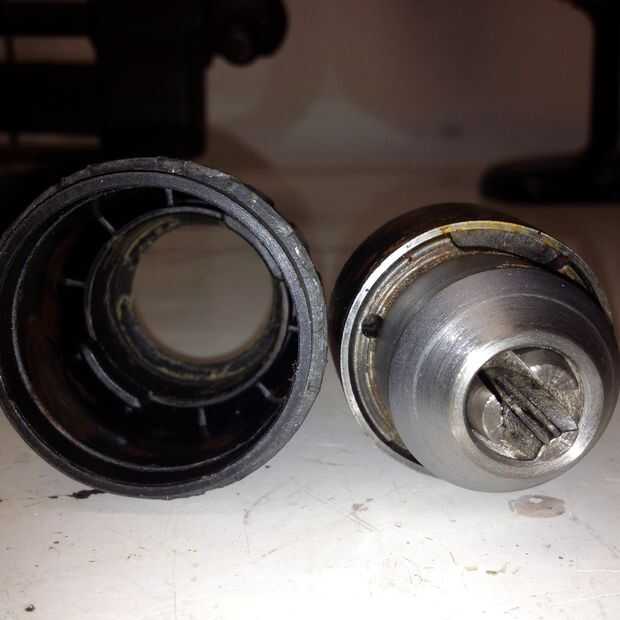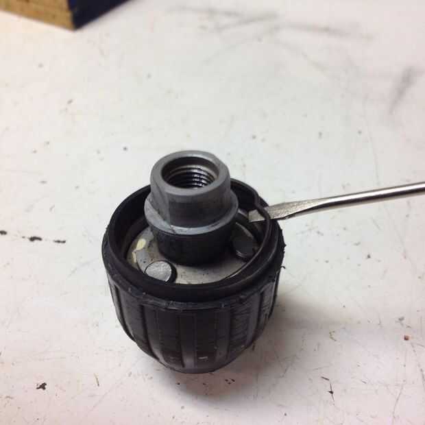 Una vez retirado el anillo de retención, puede deslizar la carcasa superior del cuerpo de chuck. Usted notará que hay dos pestañas en la parte superior de viviendas encajan en unas ranuras en el cuerpo del mismo. Estos tendrán que ser alineado durante el reensamblaje.