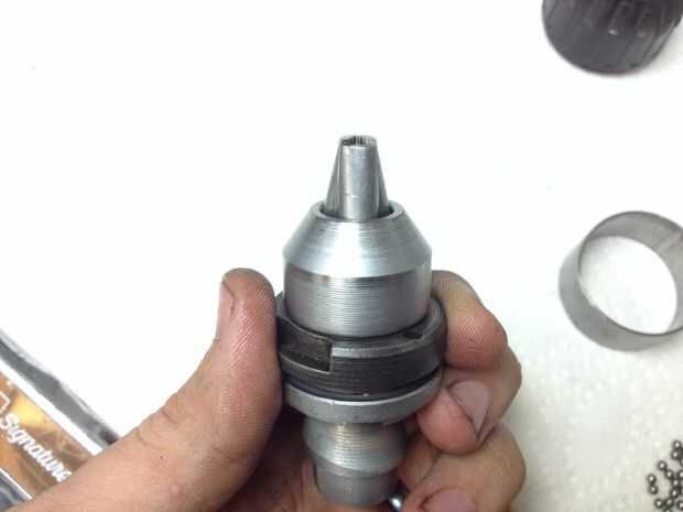 Una vez todo limpio, puede empezar a montar. Deslice las mordazas en sus cavidades correspondientes. Antes de colocar la tuerca dividida, las mordazas deban ser programado. Esto se hace poniendo las mandíbulas a la misma altura antes de instalar la tuerca dividida. Si no está programados correctamente, las mordazas no se cerrarán completamente. Prueba a ver si están programados correctamente sosteniendo ambos lados de la tuerca dividida y girando el cuerpo del mismo para cerrar las mordazas. Si las mordazas son todos la misma altura, tiene programado correctamente. Si una mandíbula está fuera de tiempo, será más bajo que los otros. Para solucionarlo, simplemente quite la mitad de tuerca dividida que está en esa mandíbula y deslice la mordaza hacia arriba hasta que llegue a tiempo. Volver a colocar la pieza de tuerca dividida y prueba otra vez. Una vez satisfecho, proceder al siguiente paso.
