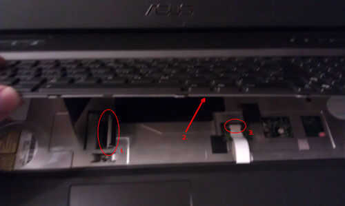 Cable número 2 es el mucho más pequeño cable que proporciona luz a tu teclado. No es visible desde el ángulo en la primera Ilustración, pero usted puede ver donde conecta en el cuadro donde se ha eliminado el teclado. Este cable se bloquea mediante dos piezas blanco pequeñas de plástico que otra vez se afloje con el destornillador pequeño de cabeza plana antes de se desprende. No se moleste con el número de cable tres por ahora.