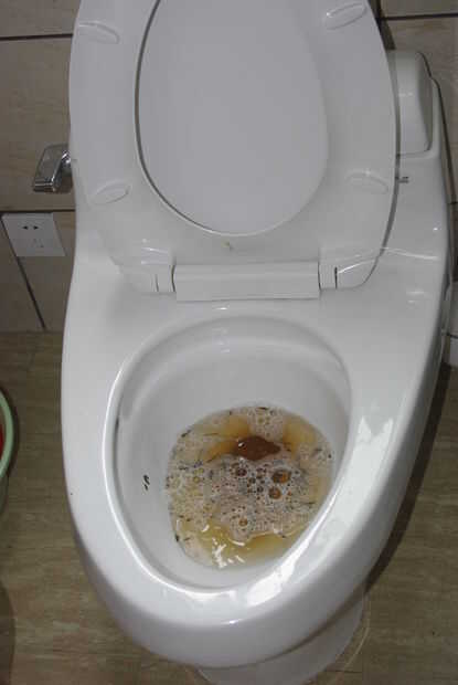 Si el nivel del agua es menor que antes de añadir más jabón y agua caliente (agua caliente no necesita ser tan caliente como la primera vez como esta vez que hay menos agua en el inodoro al calor para arriba).