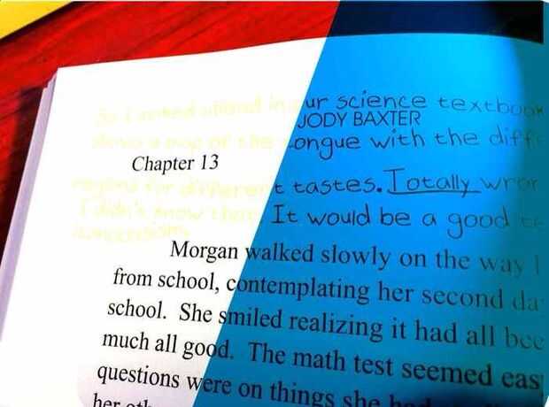 El lápiz amarillo es sólo débilmente visible en el papel de ayudar en la escritura, pero cuando se ilumina con la luz azul del LED se apagará la escritura de lápiz. Este oscurecimiento es una ilusión causada por los abrillantadores en el libro de papel que el papel de leve fluorescencia retroiluminación el lápiz amarillo opaco.