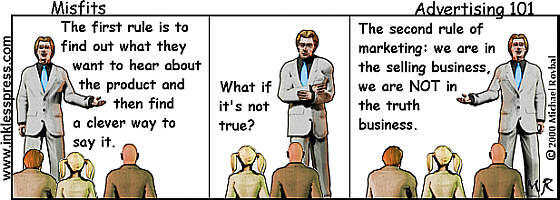 Cuando miramos las travesuras impresionante e inteligentes de la industria del marketing y la publicidad, no podemos ayudar pero estar impresionado. Si miramos más allá de la avaricia y la hipocresía que hace los anuncios exagerados y ridículos, no podemos negar que son eficaces. Nos cautivan, nos cautivará y entretenernos. Y así venden cosas, en grandes cantidades. No importa si lo que se vende es bueno para la gente o inmorales o incluso defectuoso. Nada puede ser vendido si se hace la impresión correcta. Este es el punto esencial que la gente de marketing no ha faltado. Nada puede ser vendido como nosotros, su público objetivo, está dispuesto a alejarse lo suficiente de la verdad.