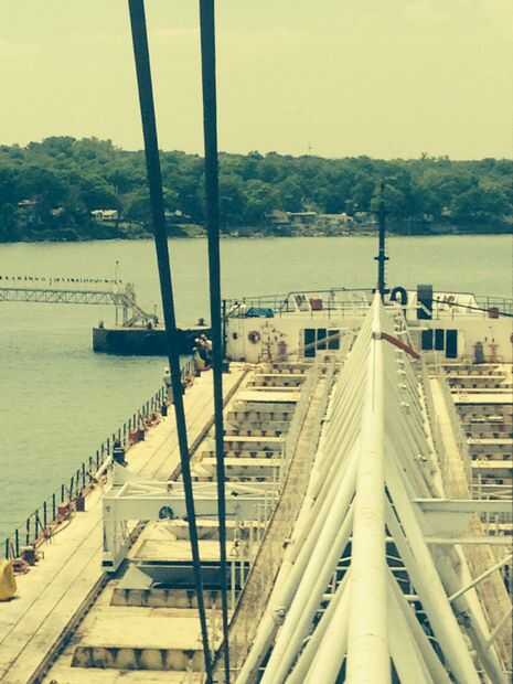Vamos a discutir lo que realmente estamos haciendo. Si nos fijamos cuidadosamente entre los cables de boom, verás 3 cabezas de machos adultos (darle un sentido de escala). Tenemos que conseguir un espacio de 6 pies en el barco (donde ellos están de pie) sobre el pie 8 sólo está disponible de espacio en el muelle donde bajarlos. Si vamos más rápido de.8 millas por hora, nosotros, en campana todo probable, soplará por el extremo del muelle, perdiendo la oportunidad. Si esto ocurre tenemos que respaldar. Sin embargo, la popa se envuelva alrededor de la base, al revés, dependiendo del viento y la corriente.