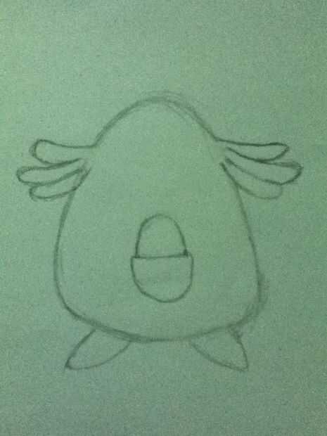 a continuación necesita dibujar una forma convexa en la parte inferior de la mitad de su cuerpo, luego poner una línea recta en la parte superior convexa que hizo y entonces ponga la mitad superior de un huevo en la parte superior de la bolsa (convexa), a continuación tienes que dibujar tres salchichas doblados... Sí dije hotdogs doblada, en la parte superior izquierda y superior derecha de su figura en forma de cuerpo/huevo, dibuje dos triángulos de tamaño mediano en la parte inferior izquierda y abajo a la derecha de
