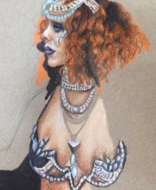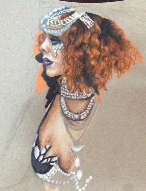 Ahora se hizo que la mayor parte de la cabeza, necesitaba empezar a trabajar en su torso y cuello. Empecé con sus joyas. Usé las mismas técnicas como el vestido de la cabeza. Me lleno en la piel, dejando los otros collares en blanco de momento. Usé marrón más aquí con negro como su cuerpo estaba más sombreado que el rostro.