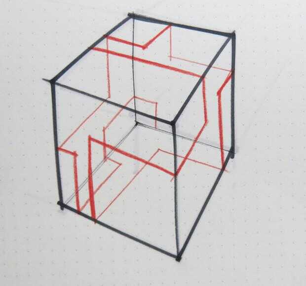 Luego dibujar una línea continua a través de la superficie que explora todas las partes de la figura. Mantener la línea en perspectiva con los lados y sólo girar en ángulos de 90 grados.