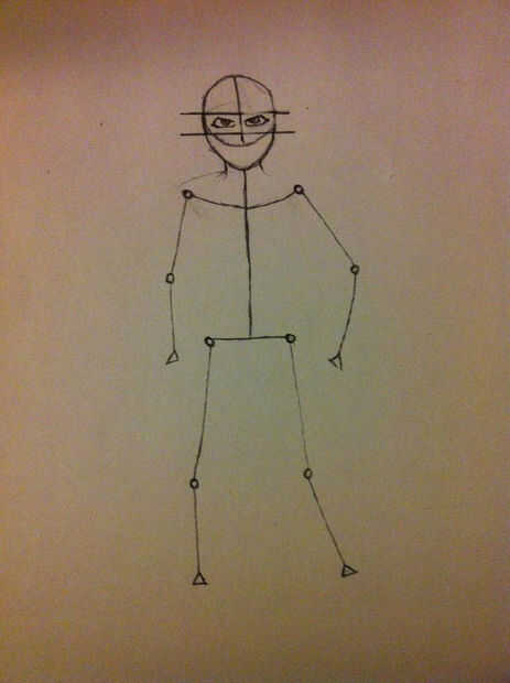 Permite pasar a la siguiente parte importante del dibujo, el cuerpo, al igual que la cabeza, tienes que construir lentamente el cuerpo del personaje, tienes que primero dibujar líneas y círculo que representa a los miembros del personaje manga. Utiliza círculos para representar la parte donde dos huesos se conectan entre sí y utiliza líneas para representar la real brazo, pierna y triángulo de la palma y los pies.