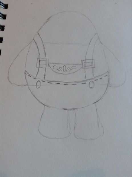 Ahora, agregar una pequeña hebilla de cada correa 3/4 de la manera abajo. Esto se logra fácilmente dibujando un cuadrado dentro de un cuadrado. A continuación, agregar una fila de simples puntadas a lo largo de la parte superior de sus britches. (Jeje... Que rima) añade dos pequeños botones ovales. Ahora, dibuje una línea recta desde el borde de una hebilla, hasta que une al borde de la otra hebilla. Luego dibujar una curva, empezando y terminando en los mismos lugares, para que sepas tiene un parche de tela atada a las correas. Dibujar el diseño poco. :)