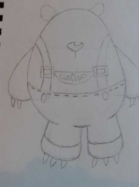 Empate en las piernas de sus pantalones y completan la forma de su pie. Dibujar opaco, redondo garras, dos para cada mano y tres para cada pie. Comenzar su nariz con una ronda, arriba abajo triángulo. Si lo desea, hacer un pequeño guión de oval-ish para la luz que refleja de su nariz.