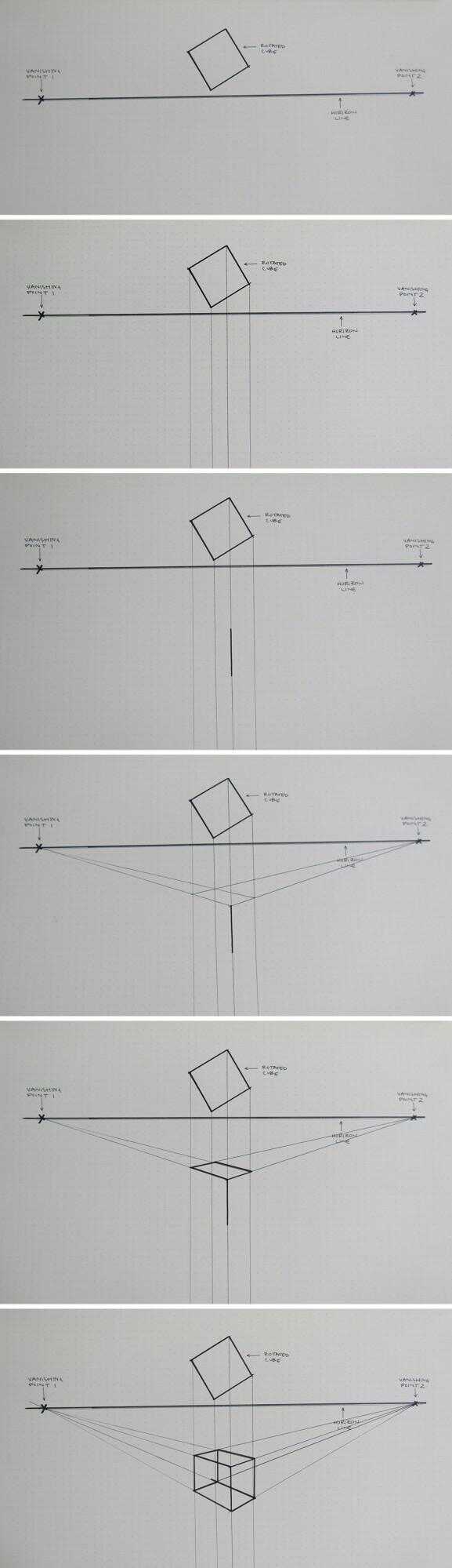 ¿Por qué empezar con un cubo? Todas las otras formas se pueden derivar de un cubo. Es la más simple forma de 3 dimensional para dibujar en perspectiva de 2 puntos.