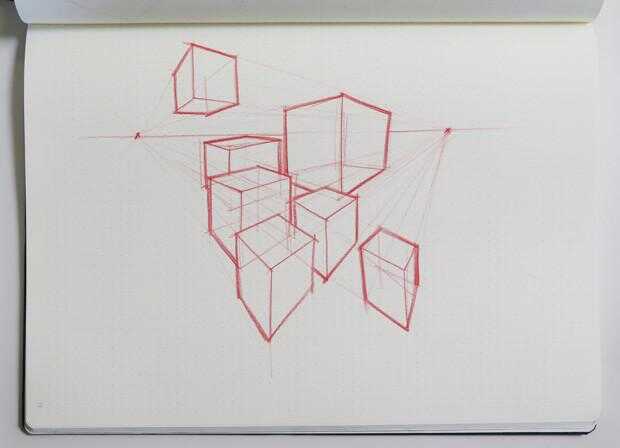 Práctica de dibujo de un campo de cubo que todos utilizan los mismos puntos de fuga.