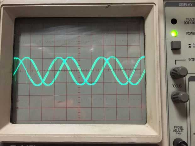 Lo primero que aparece en mi osciloscopio era un círculo, porque es una simple combinación de una onda seno y coseno. Aquí es lo que parece cada señal. Usted puede ver el x y y componentes de la imagen, como dos ondas idénticas separación 90 grados aparte.