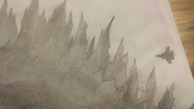 En este paso usted va centrándose principalmente en las escalas está detrás y el cuello. Una vez más, dibujar un básico hacia fuera de línea. Empecé en el cuello donde se conecta con la cabeza. Hice la cabeza en primer lugar, porque estaremos trabajando nuestro camino hacia la cola. Nos centraremos en los puntos que están alineados en la espalda y uno de los detalles más distintivos del rey de los monstruos. (Tratar de hacer los picos agudo y casi al azar buscando).
