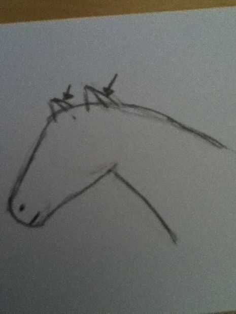 Dibujar la ventana de la nariz y la boca. A continuación dibujar dos triángulos (orejas) y luego dibujar una línea desde la punta de la oreja a la parte superior de la cabeza (las flechas señalan a las líneas en la foto). Ahora dibuja el ojo y el color en la pupila.