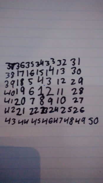 Escribir todos los números desde el número 1-lo que sea que elija en una espiral como se muestra.