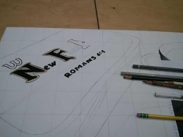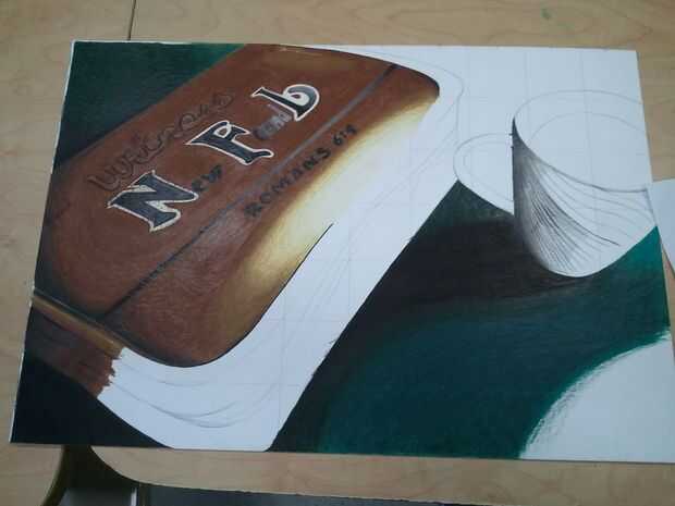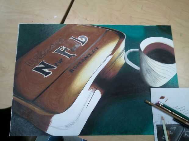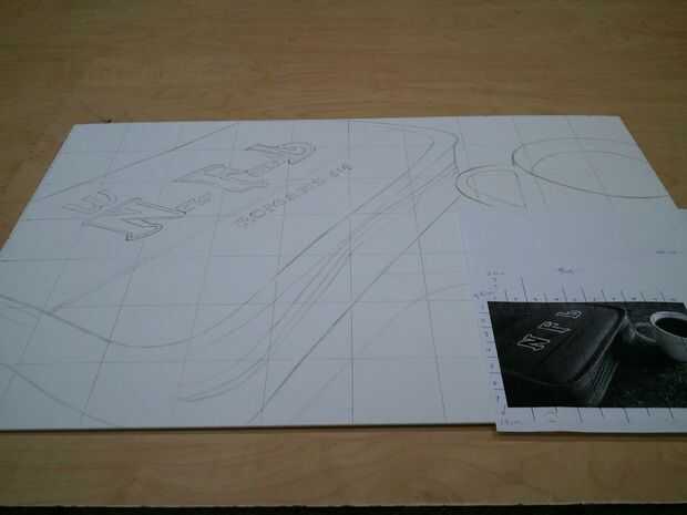 Primero imprimí un cuadro tomé en blanco y negro y bosquejó una cuadrícula en él. A continuación bosquejó una cuadrícula casi 4 veces el tamaño de la cuadrícula en la imagen en un pedazo de cartulina. De la mano dibujé un dibujo a lápiz de la imagen. Luego comencé a dibujar en el plano. Los materiales que utilicé fueron,