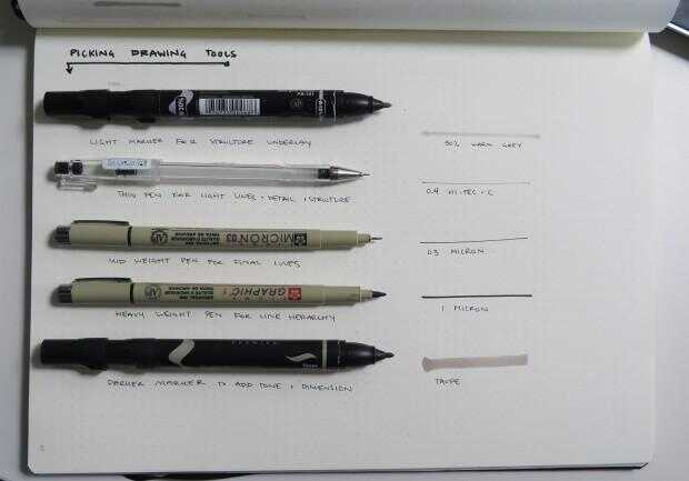He estado dibujando durante un tiempo así que me siento cómodo con los medios más rígidos como plumas peso fino. Si eres nuevo en dibujar sugeriría a partir de un medio más indulgente looser como lápices de colores, palillos de prisma o marcadores.