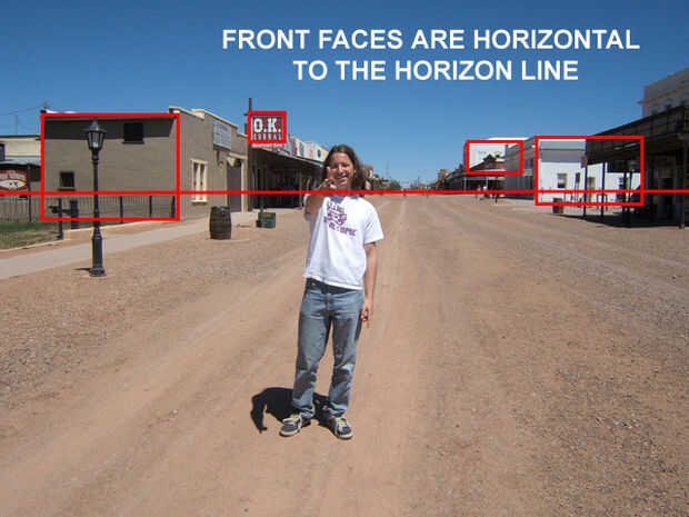 En otras palabras, si hubo un cubo entre tú y el horizonte, la cara del cubo más cercana a usted tendría dos líneas horizontales paralelas al horizonte. De hecho, todo lo visto en esta perspectiva debe tener líneas horizontales paralelas al horizonte.