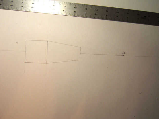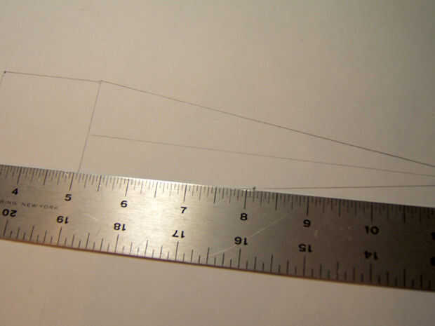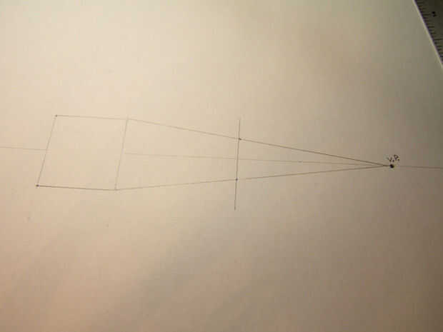 En uno las líneas que marcó, escoge un punto a mitad de camino entre la Plaza original y el punto de fuga. Hacer una pequeña marca y medir hasta qué punto es desde el borde izquierdo del papel.