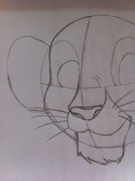 El siguiente paso es ajustar la forma de la cara de Simba. Comience con el lado derecho, le dio una mejilla por partir de una línea curva el círculo de orientación hacia el exterior del ojo. Seguimiento del contorno del ojo y Únete a la parte superior del círculo.