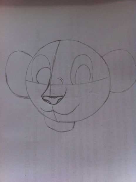 Que es las pautas básicas completa! Ahora para comenzar a añadir la forma y detalle de las características. Empezar con la nariz, completan la configuración y añadir curvas para crear los orificios nasales. Dibujar una línea que conecta la nariz a la base del ojo derecho y una línea más corta en el lado izquierdo. Añadir dos pequeñas líneas curvas por encima de la nariz para añadir un poco de carácter al dibujo.