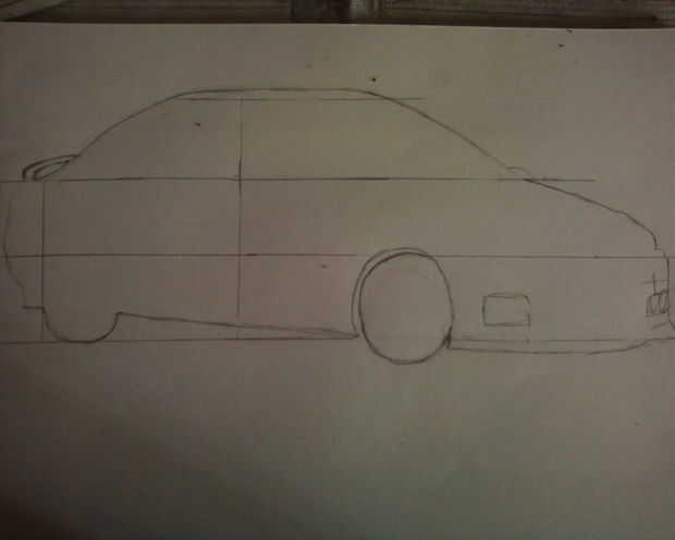 a continuación con las líneas que trazaste en el paso 1, dibujar el contorno del proyector como se muestra. Cuando se dibuja la forma del inicio de coche en la parte inferior del parabrisas y trabajar su manera para arriba. Próximo sorteo en las dos llantas y los agujeros para los faros antiniebla.