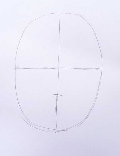 Ahora trace una línea vertical hacia abajo en el centro y una línea horizontal a través de la media. La línea horizontal es donde irán los ojos y la línea vertical es el centro de la cara. Luego dibuje otra línea horizontal a medio camino entre la parte inferior del óvalo y la línea de centro horizontal. Esta es la punta de la nariz.