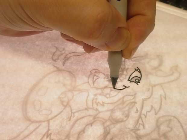 En mis inicios de dibujos se convertiría el dibujo sobre... toma un lápiz y garabatear un área negra en el lado opuesto del dibujo... luego se pone el dibujo en un pedazo limpio de papel y trace la imagen. la presión haría que el grafito de la zona negra para transferir una copia del dibujo que trazó... un poco como un pobre hombre papel carbón... No usar papel carbón porque no borrar. la imagen resultante en el papel limpio encontrarse luego con un rotulador negro de punta fina. Sin embargo más tarde conseguí una caja de luz. Esto hace una imagen mucho más fácil la limpieza!