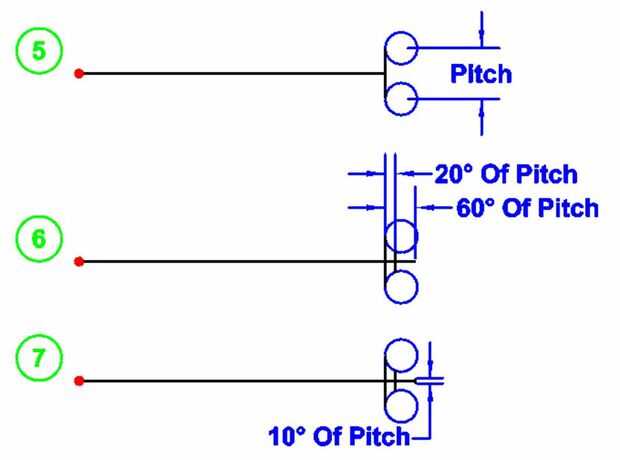 4. en esa intersección trace una línea hacia abajo la longitud de la echada y en cada extremo de la línea dibuje círculos cuyos diámetros son del diámetro de los rodillos más.005 en.