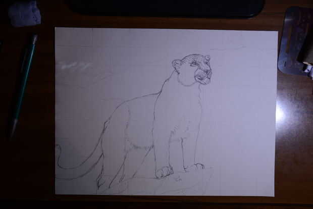 Comience usando una regla para marcar apagado las pulgadas a cada lado del papel (debe ser un 9 "x 12"). Conectar estos marcadores con recto, líneas de luz (usar su regla) hasta que tienen una cuadrícula de 9 por 12 débil, en tu hoja (si usted necesita una cuadrícula más pequeña, solo uso centímetros). Con la rejilla en su lugar, comenzar el dibujo, a partir de la roca, a continuación, el esquema básico del cuerpo. Una vez que termine esto, esboza los puntos en la cabeza y cola (y, preferiblemente, el resto del cuerpo). Después de que el bosquejo es en su lugar, utilice un lápiz mecánico de .5m m 2B para rellenar las sombras con trazos rápidos y cortos. Utilizando el soporte de herramienta de sangría, sangría los pelos blancos en los bordes de la cola, cuello y cabeza, también guión los bigotes y ojos destacados. Utilice punteados (haciendo pequeños puntos con la punta de su lápiz) para la piel en la cabeza. Sombra en los ojos.