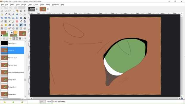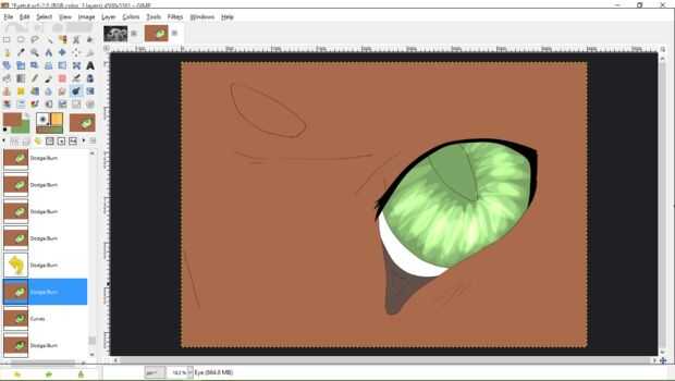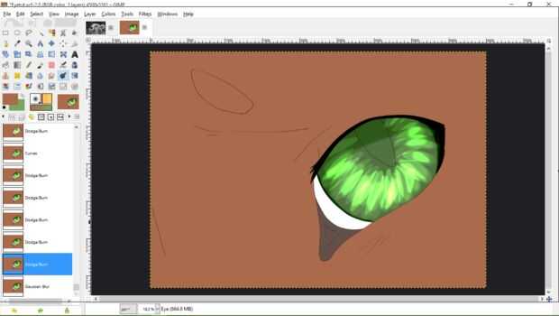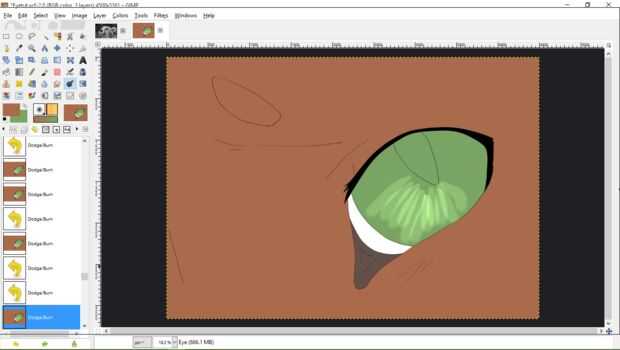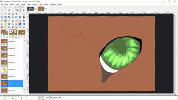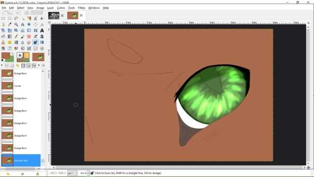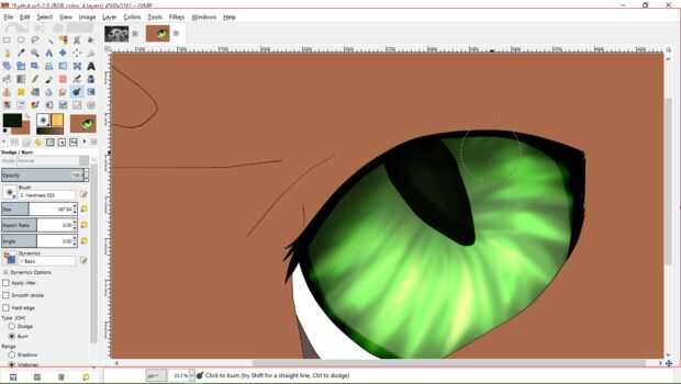 La herramienta Sobreexponer o subexponer es ideal para añadir detalles a la vista. Experimentar con diferentes configuraciones y dinámica para encontrar lo que funciona mejor para su pieza. Utilicé la configuración 'destaca' para las herramientas sobreexponer con mi dinámica de lineart y una muy grande, muy suave, cepillo redondo. Para la herramienta, cambié el modo de 'shadows'. Para hacer los bordes alrededor de los bordes del ojo, hice el cepillo más pequeño. Una vez que termines con los detalles, Desenfocar iris por unos píxeles. Utilice la herramienta dedo para suavizar hacia fuera.