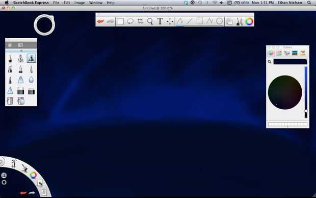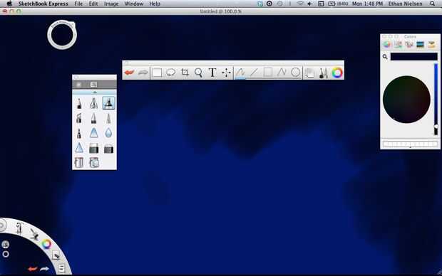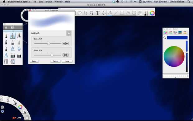 Si te fijas en el cielo de noche, son típicamente más ligeros hacia el horizonte. Si te equivocas arriba y demasiado oscuro, cambiar a otra herramienta, como la herramienta de aerógrafo. El cepillo del marcador sólo hace las cosas más oscuras. Me cambié a la aerografía, aumentó la circunferencia, y manteniendo pulsada la tecla opción (que cambia a la herramienta Cuentagotas de ojo) fue capaz de seleccionar mi color de fondo azul y volver por donde quería más ligero.