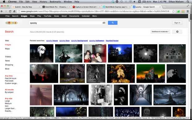 Ahora, qué dibujar. En primer lugar, usted necesita una idea. Mi pensamiento era escriba 'spooky' en Google y ver lo que ocurrió en las fotos. Casas encantadas, algunos niños viendo TV (?), lunas, monstruos y un montón de azul oscuro y negro.