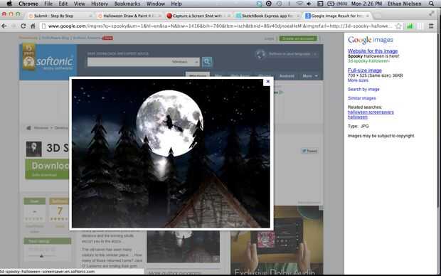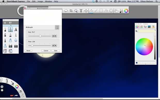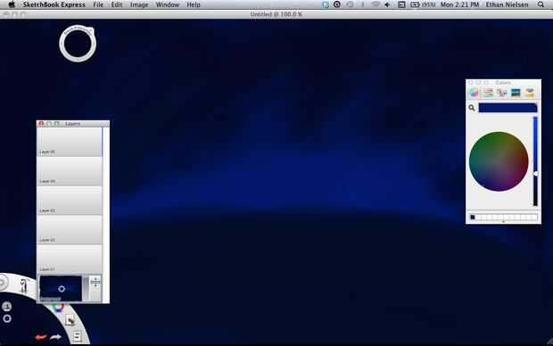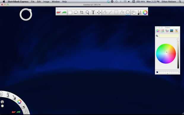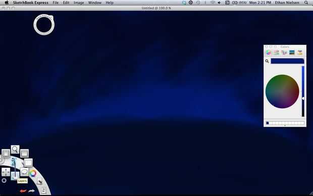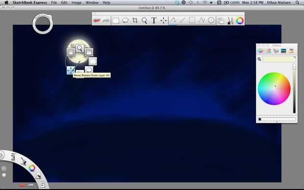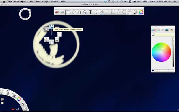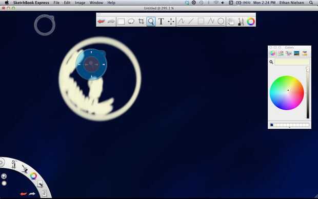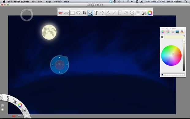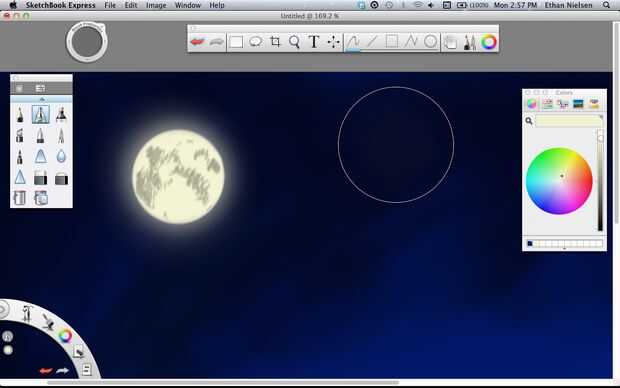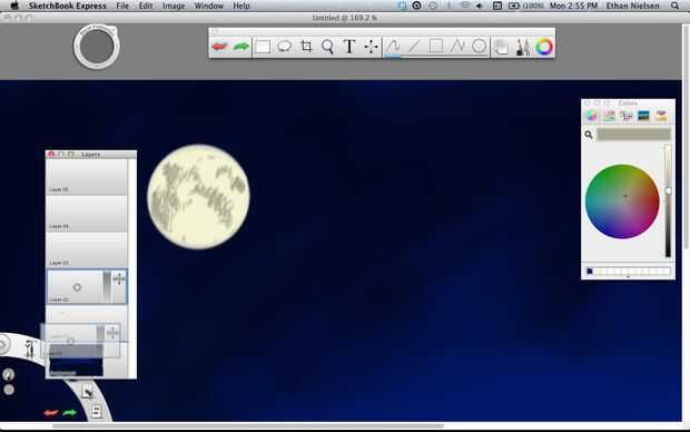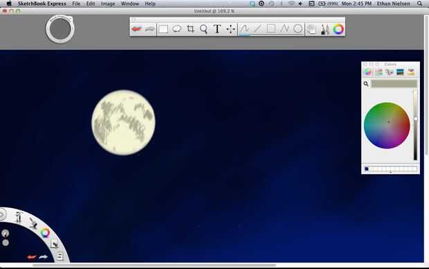 Haga clic en el modo de círculo en la larga barra de herramientas. (Si ha cerrado ir a 'Ventana' y elija 'ToolBar'). Hay una barra deslizante debajo de él para indicar si está seleccionado. Luego elegir un punto y haga clic en y arrastre manteniendo pulsada la tecla shift; Esto hará un círculo perfectamente redondo. Cambiar al modo de freehand (el garabato en la barra de herramientas) y rellene su luna. O elegir el bote de pintura, que será más fácil. Si quieres hacerlo un poco más realista, encontrar una imagen de referencia de la luna y el color ese círculo como él. Primero eligió un color gris bajando la botella en la paleta de colores y luego color similar a la imagen de la luna. Eso es bastante bueno; una luna pasable.