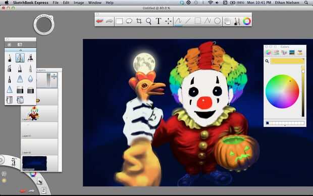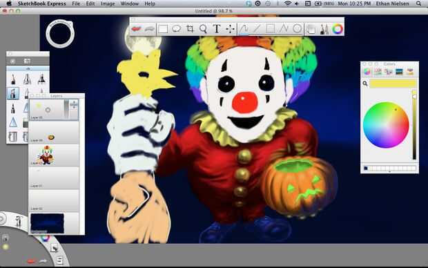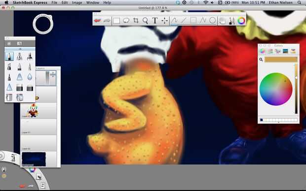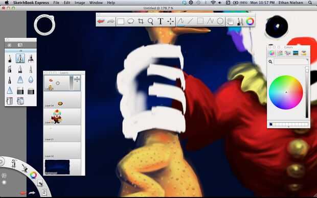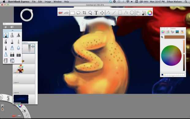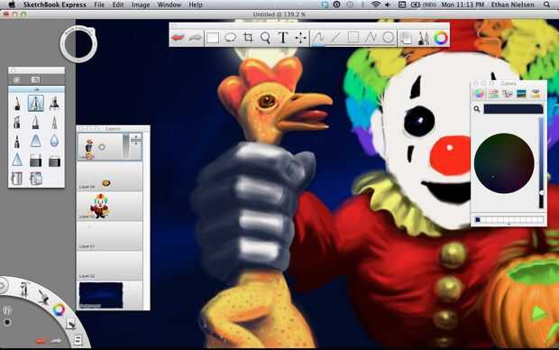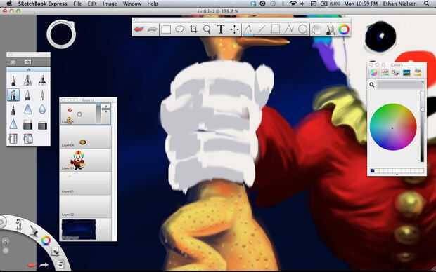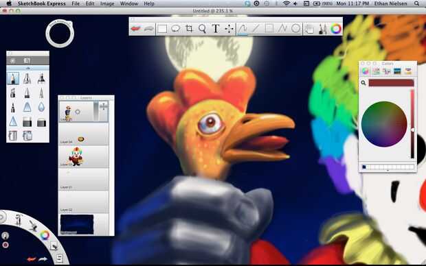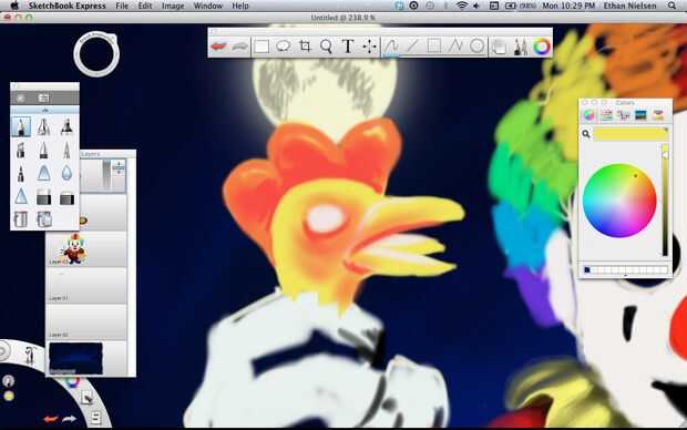Next we’ll make a rubber chicken. Lo hice en capa 05, que es la capa superior y la última de las capas. Bueno, ¡ espero que ya no necesitamos. Si tienes SketchBook Pro, esto no será un problema. Otra vez rellenar el pollo, color amarillo agradable y realista, al igual que pollos de goma real tienen y peine rojo, un pico abierto y su lengua de fuera. Darle cierta profundidad utilizando el aerógrafo, entonces pasemos al cuerpo. El fondo de dibujo te da una idea aproximada donde poner cosas, pero usted querrá borrar algunas de ellas si es leerlo alrededor de los bordes de la capa superior de dibujo. Una vez que el polluelo es agradable y suave, le dan algunos golpes. Lo hice con el lápiz y hacer manchas oscuras, y luego volver y hacer puntos de luz en la parte superior. No es perfecto, pero funciona.