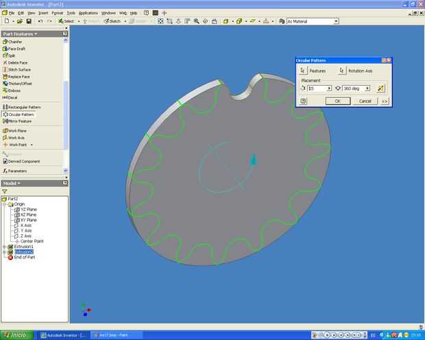 Ahora uso esa protuberancia para hacer un patrón circular, debe ser igual al numero de dientes.