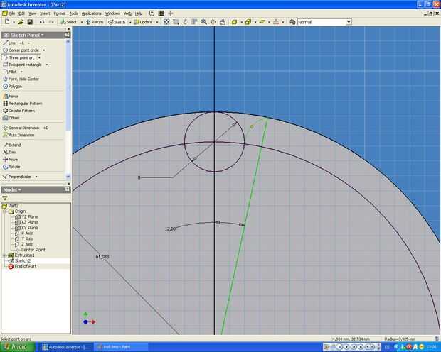 Corte el circulo quedandose con la parte inferior, y dibuje un arco entre la linea y el circulo externo. De su radio debe ser 5mm.